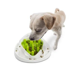 Met de poot, tong of neus, het kan allemaal. Vermindert het schrokken enorm en is geschikt voor zowel droog als nat hondenvoer.