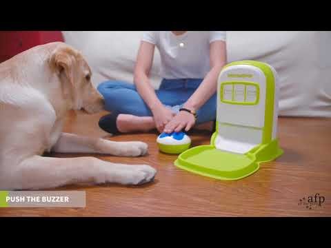 Deze gokautomaat strooit met beloningen voor de hond wanneer er op de afstandsbediening (in de vorm van een bal) gedrukt wordt.