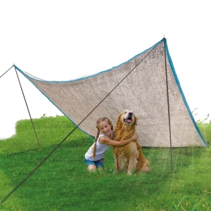 Het doek is gemaakt van speciaal hoog-reflecterend aluminiummateriaal en zeer licht in gewicht (2 kg). Het weerkaatst uv-straling en warmte en biedt daarom een koele schaduwplek.