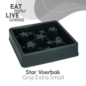 Met de Eat Slow Live Longer Star slowfeeder behoort schrokken tot het verleden! Deze voerbak met een sterrenpatroon zorgt ervoor dat een hond of kat lastiger bij het droogvoer kan, waardoor het huisdier minder grote happen neemt, langzamer eet en beter kauwt. De slowfeeder is voorzien van anti-slip voetjes aan de onderzijde en is vaatwasserbestendig.