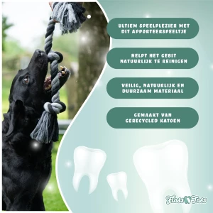 Dit geweldige flostouw van Floss Dental Rope is gemaakt van 100% natuurlijk katoen, waardoor het veilig, duurzaam en milieuvriendelijk is. Het is speciaal ontworpen voor apporteer- en trekspelletjes met honden. Tijdens het spelen helpt het flostouw niet alleen om de gezondheid van de mond van je hond te verbeteren, maar ook om de tanden en tandvlees te reinigen. Dit komt door de speciaal ontworpen vlechtwerktechniek die gebruikt wordt, waarbij alleen hele draden worden gebruikt, waardoor het flostouw strakker gevlochten is en veel sterker dan reguliere flostouwen. Bovendien is het gemaakt van gerecycled materiaal, dus het is niet alleen goed voor je hond, maar ook voor het milieu.