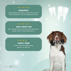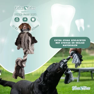 Dit geweldige flostouw van Floss Dental Rope is gemaakt van 100% natuurlijk katoen, waardoor het veilig, duurzaam en milieuvriendelijk is. Het is speciaal ontworpen voor apporteer- en trekspelletjes met honden. Tijdens het spelen helpt het flostouw niet alleen om de gezondheid van de mond van je hond te verbeteren, maar ook om de tanden en tandvlees te reinigen. Dit komt door de speciaal ontworpen vlechtwerktechniek die gebruikt wordt, waarbij alleen hele draden worden gebruikt, waardoor het flostouw strakker gevlochten is en veel sterker dan reguliere flostouwen. Bovendien is het gemaakt van gerecycled materiaal, dus het is niet alleen goed voor je hond, maar ook voor het milieu.