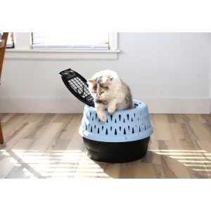 De Petmate Get-A-Round Kennel is de eerste ronde, kunststof reismand voor katten. De reismand heeft een innovatief design dat de natuurlijke nesteldrang en de knusse slaaphouding van katten ondersteunt. Het helpt een veilige en comfortabele plek te creĆ«ren, waarin katten zich beschermd voelen op stressvolle momenten (zoals een bezoek aan de dierenarts). Dankzij de grote opening aan de bovenzijde kunnen katten eenvoudig in en uit de reismand getild worden.Ā